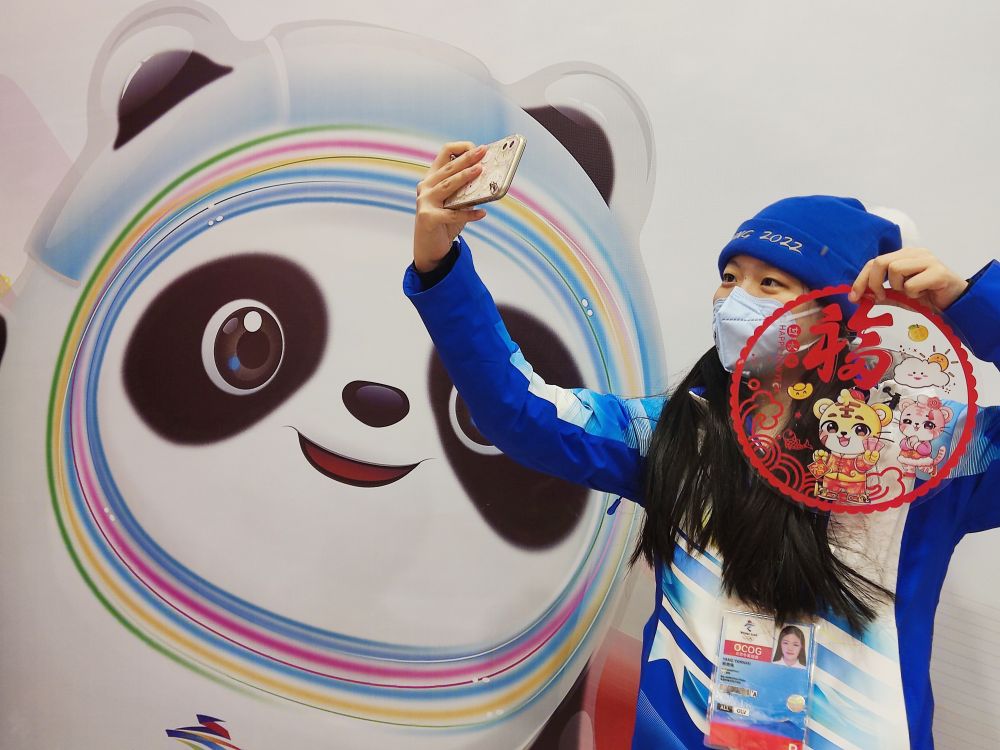 A volunteer poses for selfies at the Olympic Village for the Beijing 2022 Winter Olympics in Yanqing District of Beijing, capital of China, Jan. 31, 2022. Delegation members and volunteers celebrated the Chinese Lunar New Year, or the Year of Tiger at the Olympic Village on Monday. (Photo by Luo Minli/Xinhua)