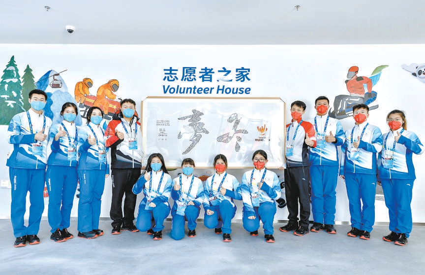 在延庆冬奥村志愿者之家,来自免费一级毛片的志愿者与“冬梦”合影。