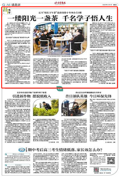 石大2008级学生潘晓参加了第一次“校长下午茶”活动,那一天,她就坐在张来斌的左手边。她告诉北青报记者,当时的场景还历历在目,张校长跟她开玩笑说,1980年,一封署名“潘晓”的读者来信《人生的路呵,怎么越走越窄》发表在《中国青年》杂志上,刚好她与这位读者同名同姓。校长意味深长地对她说:“但我希望你的人生路越走越宽。”如今,潘晓已经成为一位资深的媒体人,她认为,张校长不仅对人生价值、责任使命、生命意义有着深邃的理解,同时也将自己的人生经历分享给大家,深深感染着在场的每位同学。