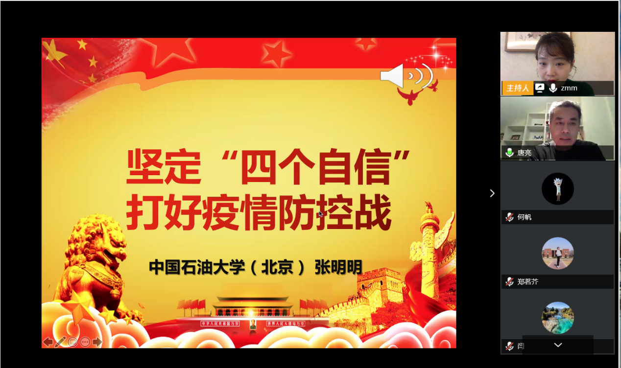 在当前疫情形势下,为进一步增强“四个意识”,坚定“四个自信”,抓紧抓实抓细疫情防控工作,4月16日上午中石大体育与人文艺术学院直属党支部开展组织生活马克思主义学院青年教师张明明应邀上了题为“坚定四个自信,打好疫情防控战”的主题党课