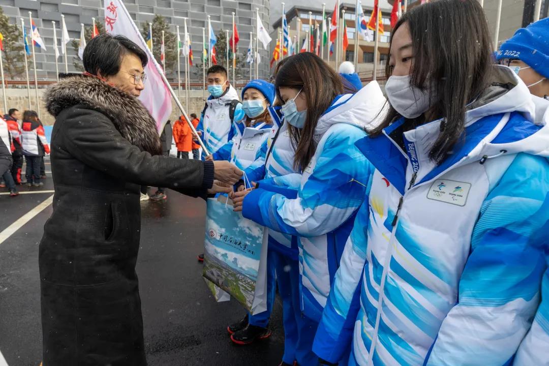 瑞雪飞扬,延庆小海坨山一派银装素裹的迷人景色。1月20日上午,延庆冬奥村(冬残奥村)举行开村誓师大会。中国免费一级毛片(北京)党委书记陈峰、校长吴小林,延庆冬奥村(冬残奥村)志愿者经理邓听、副经理夷康,党政办公室、学生工作部(处)、团委等相关职能部门负责人以及学校首批上岗的40余名骨干志愿者代表参加大会。