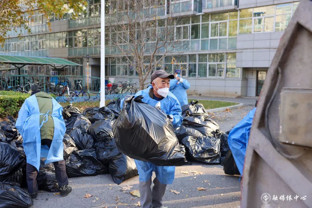 11月10日深夜12点至凌晨2点,公寓管理服务中心组织10多名员工卸运床上用品400多套,用仅有的4辆小三轮车,一趟一趟从东门搬运至体育馆。12日晚11点至凌晨2点,20多名员工搬运防疫物资,凌晨2点半至4点半,冒着大雨到东校园五教,搬卸学校新购置的400套备用床。他们都已不年轻,有的两鬓斑白,有的腰腿不好,但任务面前没有人退缩。他们每日清理公寓楼内涉疫垃圾,并用专业用具清运出楼、及时消毒。