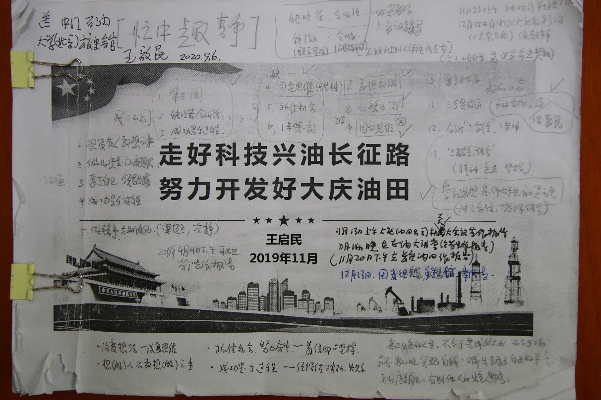 展览筹备策划时,为突出体现王启民的科研攻关之路,对今天的青年科技工作者有示范引领作用,原定以 “王启民的科研长征路”为展览主题。启民校友得知后,态度很坚决地要求我们更改为“大庆油田开发的科研长征路”。老人家说,大庆油田高产稳产27年,是所有大庆油田科研人员共同奋斗而得出的成果,绝不能写成好像是我一个人的贡献。从中我们看到了启民校友的严谨、谦虚、淡泊名利、对大庆油田的热爱和对团队的高度重视!
