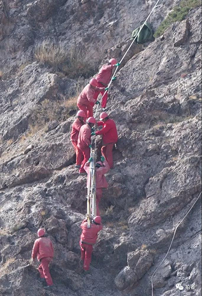 通道建成后,就成为队员们施工的必经之路。第一道工序测量组相对容易些,第二道工序钻井组就非常困难了。每钻完了一口井,就需要搬家一次。钻井组队员们要将2个空气压缩机、3个发动机、1个操作台和15跟钻杆合计250多公斤的设备从山下运到山顶。最难的一个地方,30个人用了三四天时间,才把机器运上去。“稍有闪失,人就会从山上掉下来,非常危险。”