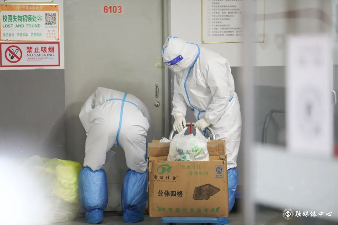 安全与海洋工程学院教师叶迎春,10日就入驻了东校园,负责汇才公寓6号楼的送餐工作。当时6号楼有八九百名学生,但是送餐的老师只有4位,防护服里汗水一道道往下流,贴身的衣服全都粘在了身上。“没有一个冬天不可逾越,让我们用辛勤奋斗迎接疫情防控的春天!”