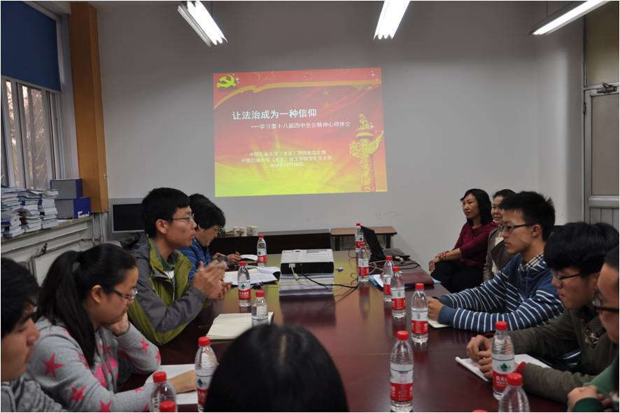 10月29日,石大国资处党支部与化学工程学院本2013党支部在办公楼B座102会议室开展了题为“让法治成为一种信仰——学习十八届四中全会精神体会”的“一对一”党支部活动。机关党总支负责人以及来自国资处党支部和化学工程学院本2013学生支部的党员、入党积极分子约30人参加了活动。