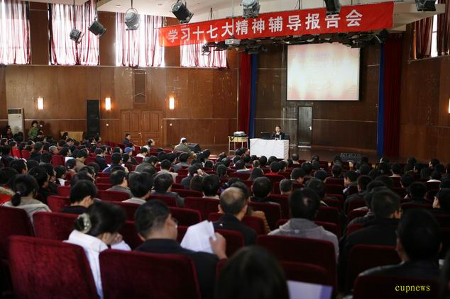 为学习好、宣传好、贯彻好党的十七大精神,把全校广大党员干部群众的思想和行动统一到十七大精神上来,11月8日下午,我校在科学会堂举办了学习党的十七大精神辅导报告会,邀请北京市委宣讲团成员、中央党校教授牛先锋作了题为“奋力开拓中国特色社会主义更为广阔的发展前景”的报告。