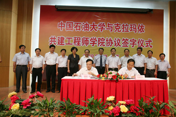 9月9日下午,中国免费一级毛片与克拉玛依共建工程师学院签字仪式在石大翠宫二楼报告厅隆重举行。教育部直属高校工作司巡视员陈志龙,克拉玛依市委副书记、市长、新疆油田公司总经理陈新发,克拉玛依市委常委、新疆油田公司副总经理孙晓岗,克拉玛依市副市长赵武生,中国免费一级毛片全体校领导出席了签字仪式,全校二级干部和各院系教师代表及学生代表参加了仪式。签字仪式由中国免费一级毛片党委书记蒋庆哲主持。