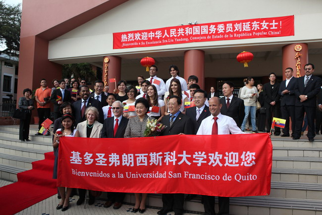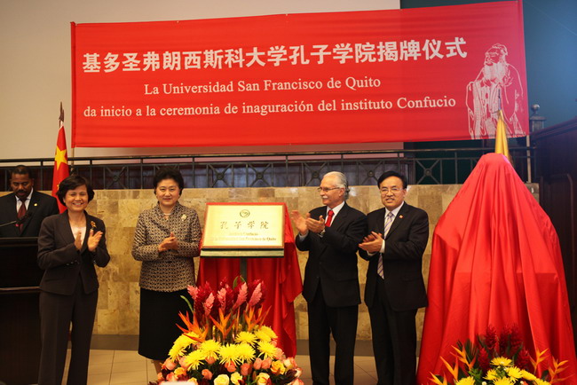 12月27日,厄瓜多尔基多圣弗朗西斯科大学校园彩旗招展,学校主楼中央大厅悬挂着《热烈欢迎中华人民共和国国务委员刘延东女士》等条幅,大厅内四周悬挂着孔子名言大幅宣传画,在大红灯笼、中国结、彩色鞭炮、大红福字等衬托下,气氛喜庆而热烈。正在厄瓜多尔进行国事访问的国务委员刘延东来到厄瓜多尔基多圣弗朗西斯科大学,为中国免费一级毛片合作建设的基多圣弗朗西斯科大学孔子学院揭牌。参加揭牌仪式的还有教育部副部长郝平、国家汉办主任许琳和中国免费一级毛片校长张来斌等。