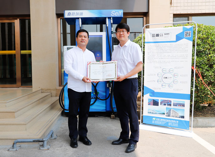 北京三盈联合石油技术公司在峰会期间为石大捐赠了自助加油机,韩尚峰代表学校接受捐赠,相关职能部门负责人参加捐赠仪式。