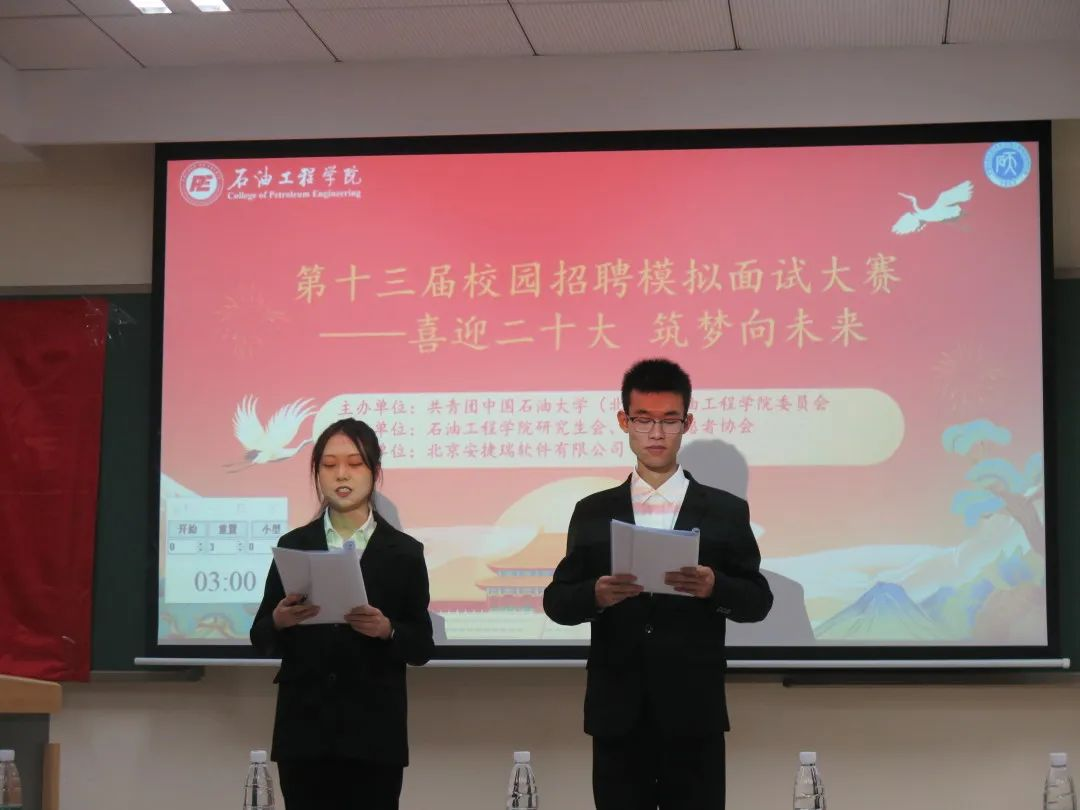 为帮助学生找准职业目标,感受真实求职场景,为广大学子搭建从校园到职场的桥梁。经过学生报名、简历初筛,第十三届”喜迎二十大,筑梦向未来“招聘模拟大赛决赛于10月9日在东校区东教211教室顺利举办,共有8名来自全校各学院的优秀选手脱颖而出,角逐决赛桂冠。本次活动得到校友企业--北京安捷瑞软件有限公司独家赞助!