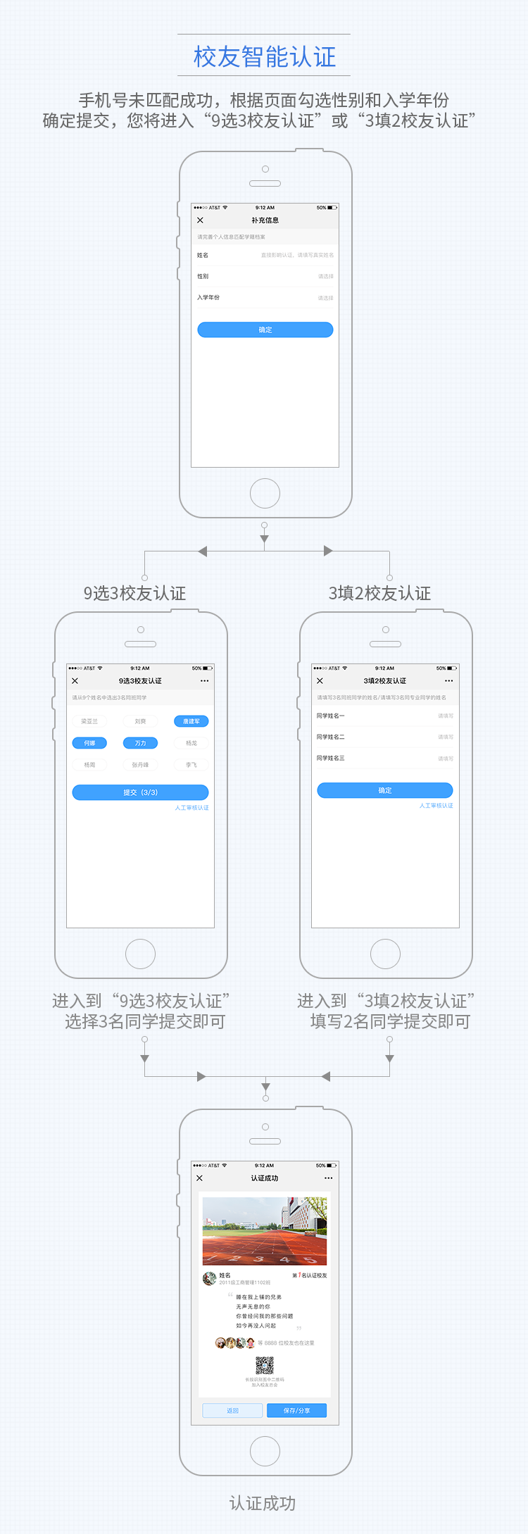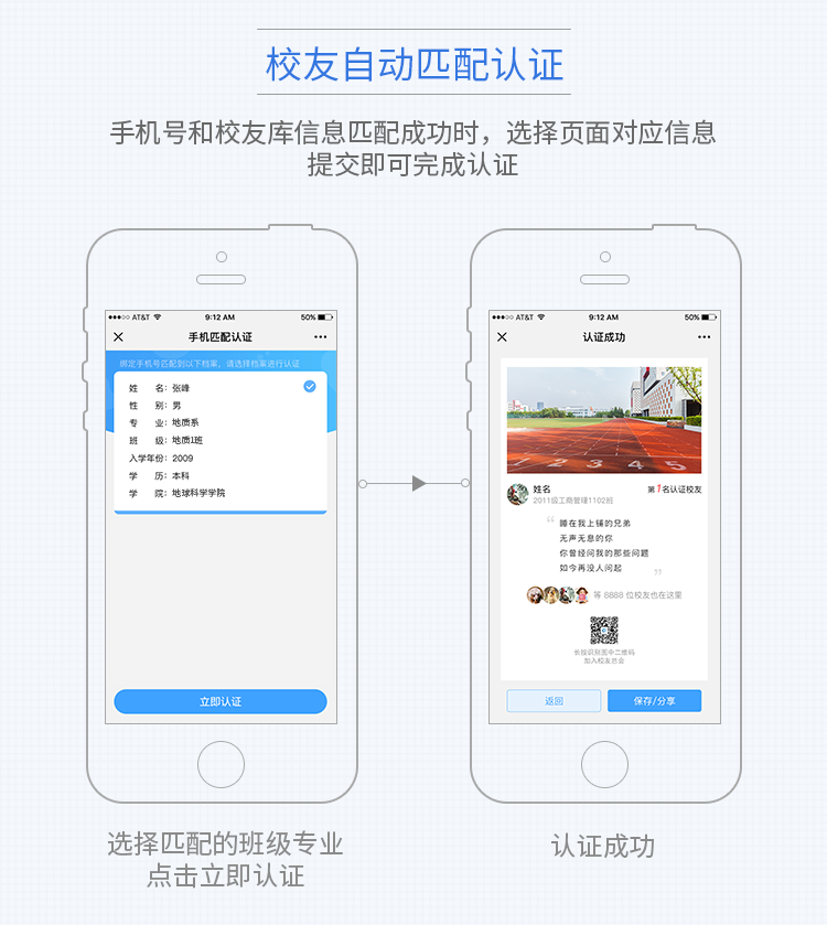 第三步:当注册使用的手机号、校友姓名与智能库匹配时,则自动匹配通过认证,参与校友平台互动。