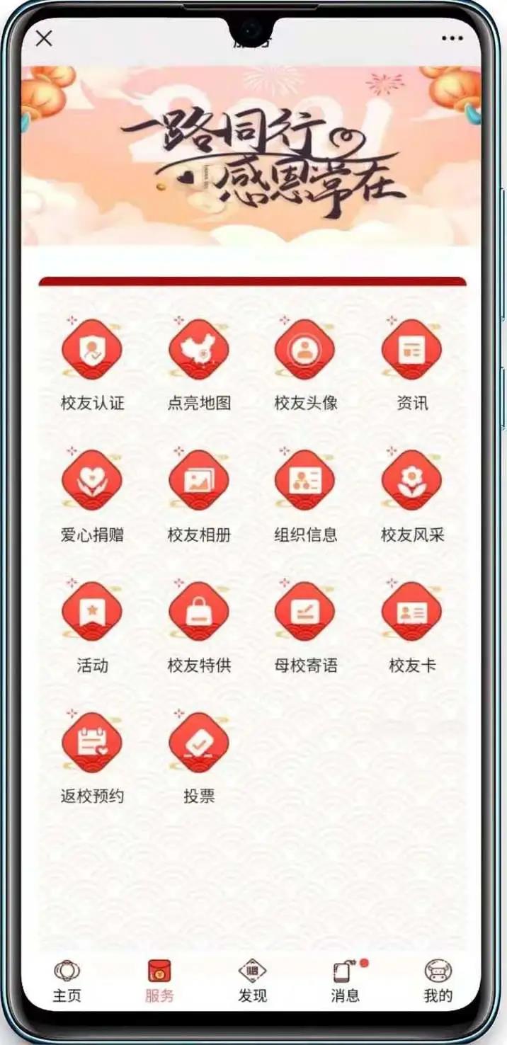第二步:点击“服务”进入服务页面,点击“校友卡”进行申领;