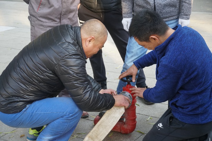 在灭火器操作考核中,参训人员按照“一提二拔三压四喷”的标准流程扑灭火盆中的火;消火栓操作考核中,参训人员两人一组,一人负责接消火栓,开启阀门;另一人负责铺水带、连接水枪,出水至目标。在操作过程中,参训人员进一步熟悉了现场处理火情的正确流程,更好的掌握了灭火技能。