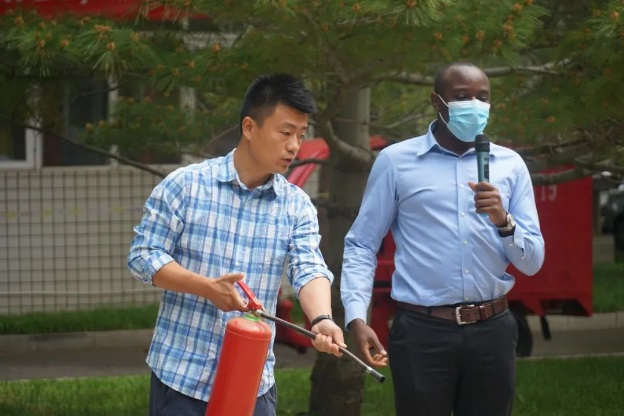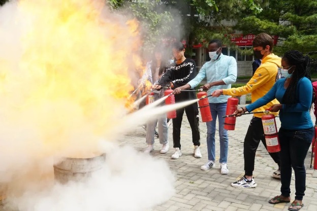 演练结束后,保卫处工作人员现场讲解、示范并指导留学生使用灭火器、灭火毯,进一步强调了学生公寓的日常消防安全注意事项。