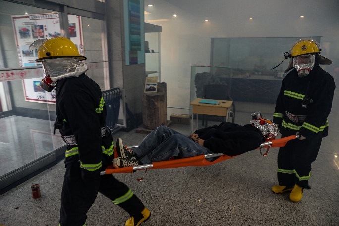 微型消防站队员穿着全套消防战斗服迅速奔赴起火现场,灭火1组手持灭火器冲进火场,扑灭初期火灾。灭火2组迅速铺开消防水带,连接消火栓向室内喷水灭火。医疗救护组手持担架与呼吸器,冲入火场抢救被困人员。