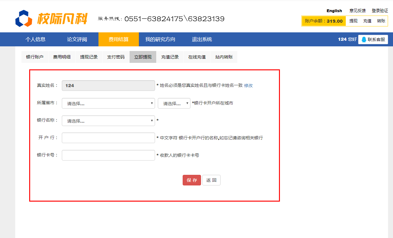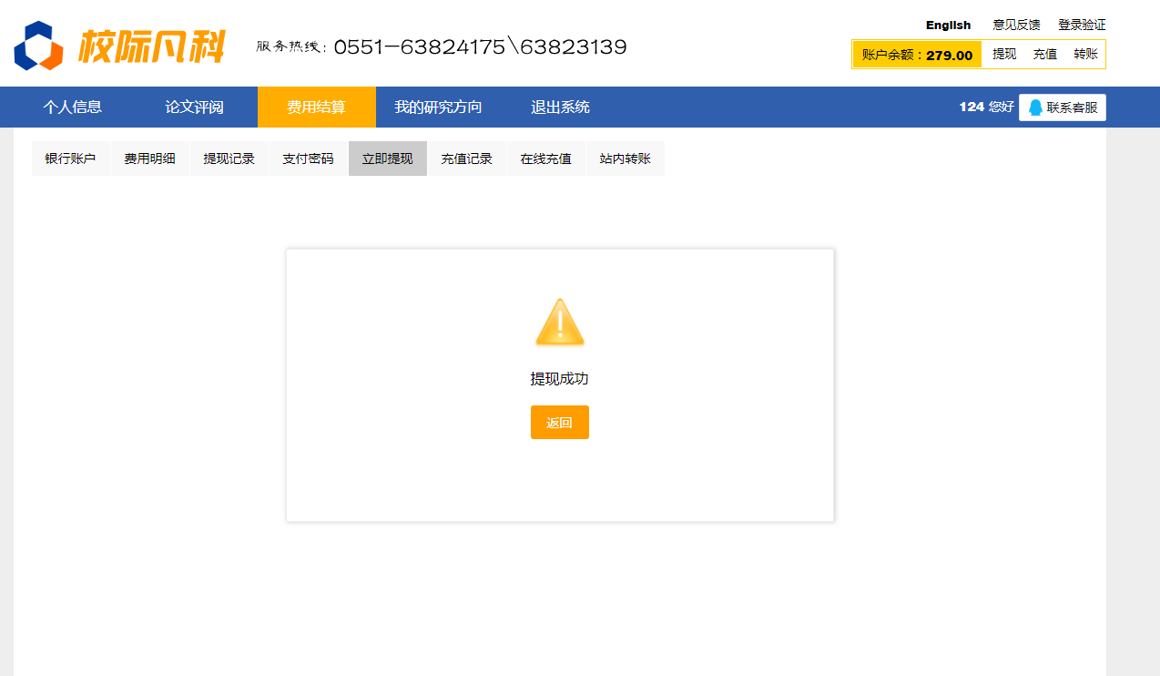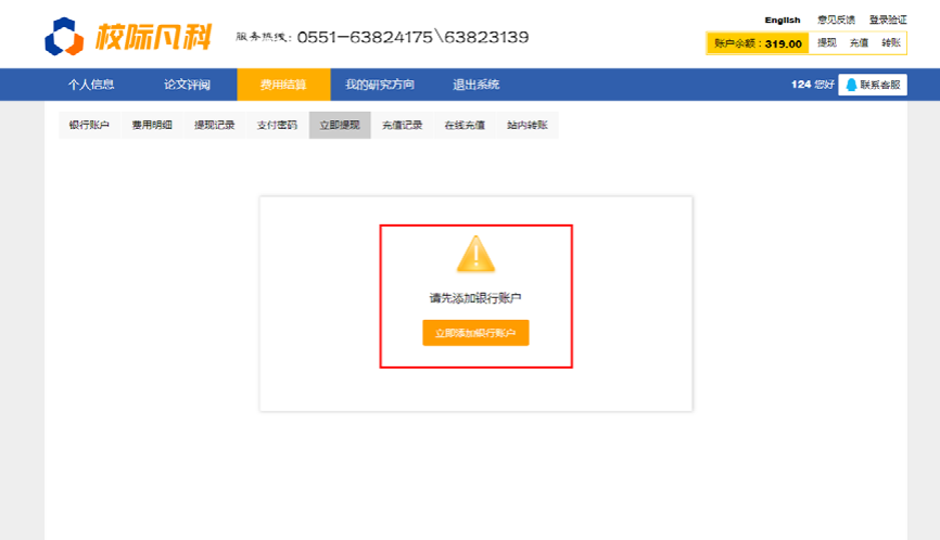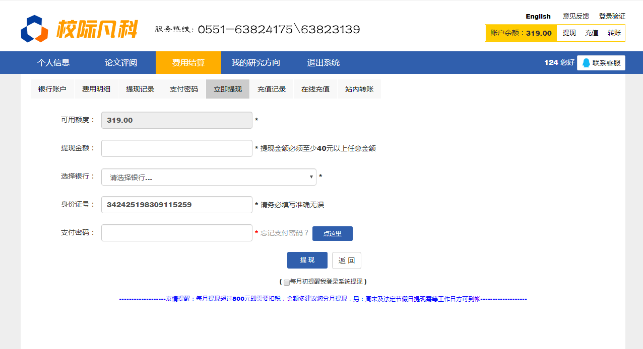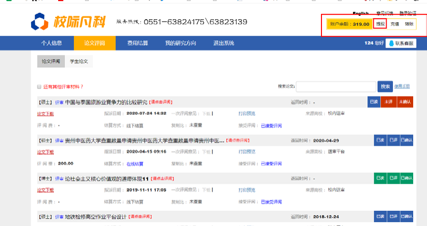 如果结算方式是线下结算或是校内送审的,请联系学校秘书或是分给您论文的老师。 结算方式是“在线结算”的。您点“最终定稿”后,刷新平台,您的账户余额会自动增加本篇论文的评审费。可在线提现(绑定银行卡,设置支付密码, <此处的支付密码并不是您的银<>行卡密码,是您用于平台提现设的密码。用于后期提现用>    );