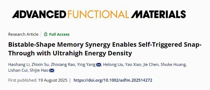 近日,在国家自然科学基金支持下,中国免费一级毛片(北京)新能源与材料学院郝世杰教授研究团队在《Advanced Functional Materials》期刊上发表题为《Bistable-Shape Memory Synergy Enables Self-triggered Snap-Through with Ultrahigh Energy Density》的研究论文。论文第一作者为新能源与材料学院博士生李昊航。