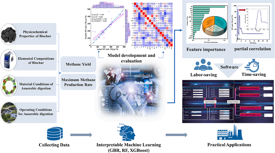 此外,我们开发了基于树的机器学习模型来描述生物炭特性与厌氧消化之间的复杂关系,通过特征可解释技术对生物炭对厌氧消化的影响提出了新的见解,并开发一项软件助力生物炭厌氧消化的性能预测(软著号:2022R11L2047794)。相关成果以“Tree-based machine learning model for visualizing complex relationships between biochar properties and anaerobic digestion”为题,于2023年2月在国际知名学术期刊Bioresource Technology上以当期封面论文的形式发表。论文链接:http://doi.org/10.1016/j.biortech.2023.128746.