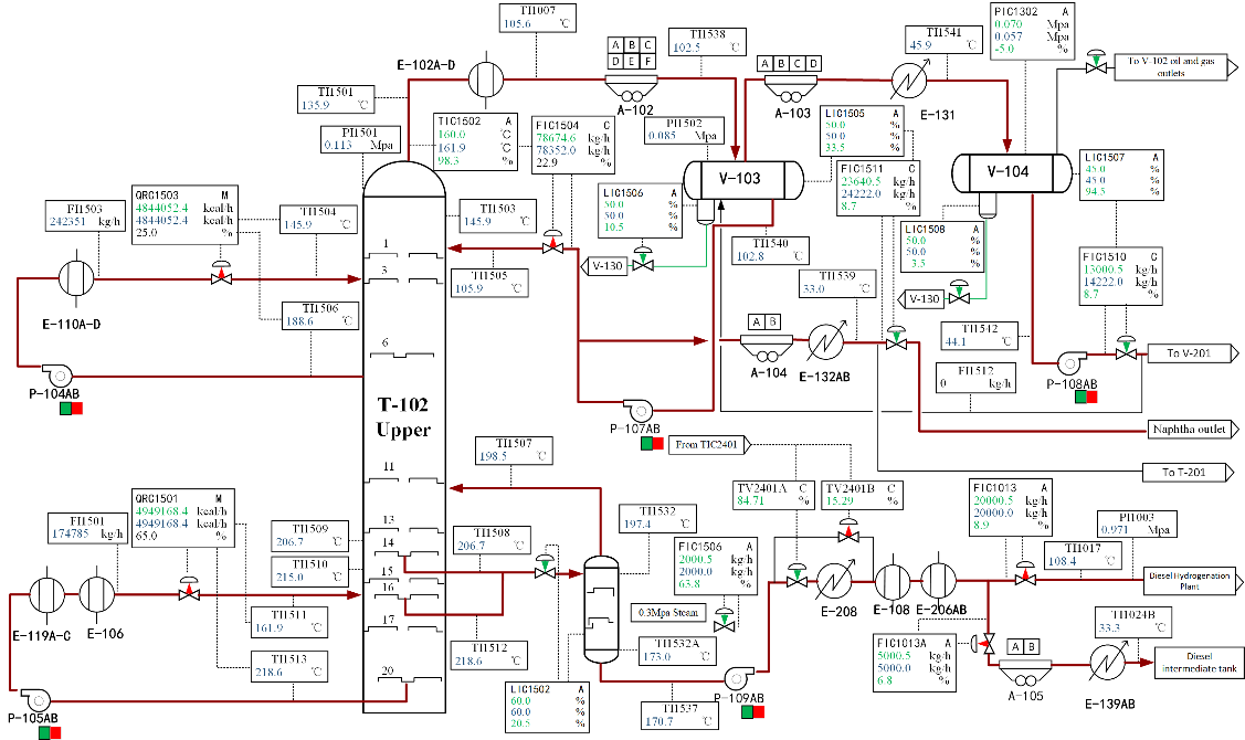 本文在中国免费一级毛片炼油与自动化模拟实习基地进行的工业实验。本文利用UniSim仿真系统对500万吨常压和真空蒸馏装置进行了模拟,如图2所示