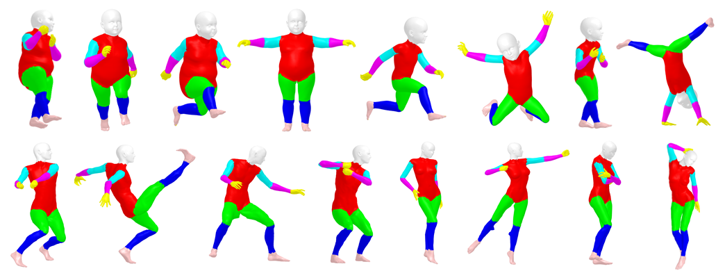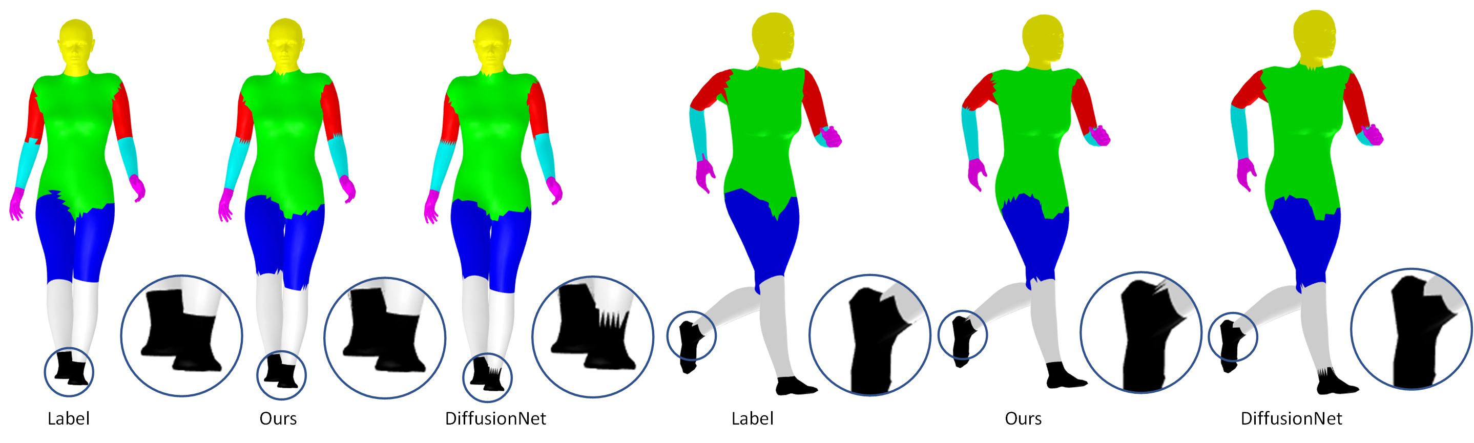 将DGANet在SHREC数据集上的语义分割结果可视化,如图2所示。通过放大局部细节,与DiffusionNet对比,DGANet的语义分割精度高于DiffusionNet,细节更加准确,更接近真实分割结果,证明DGANet具有较强的鲁棒性。进一步,图3第一行、第二行分别展示了KIDS与TOSCA数据集的分割结果。可以看出,对于不同姿势的三维人体模型,本章方法均取得良好的语义分割效果,表现出较强的鲁棒性。