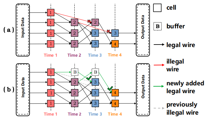 图3.(a)路径平衡前的电路,(b)路径平衡后的电路(通过插入buffer满足同步和线长约束)