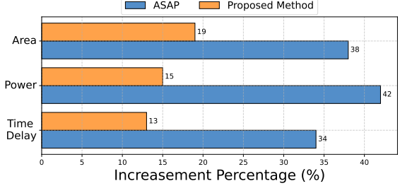 通过柱状图展示了在c3540测试例上,应用ASAP算法和本文提出的算法后,电路的延时增加百分比、功耗增加百分比和面积增加百分比的比较。结果显示,与ASAP算法相比,我们提出的算法的电路的延时、功耗和面积的增加百分比均显著降低,表明算法在优化电路性能方面具有显著优势。具体来说,延时增加百分比从34%降低到13%,功耗增加百分比从42%降低到15%,面积增加百分比从38%降低到19%,体现算法在提升电路效率方面的有效性。