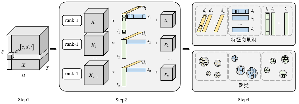 接下来针对时空模式提取的问题,本文设计了一种结合聚类的连续秩一张量分解方法用于综合参数时空模式的提取,具体过程如图1所示: