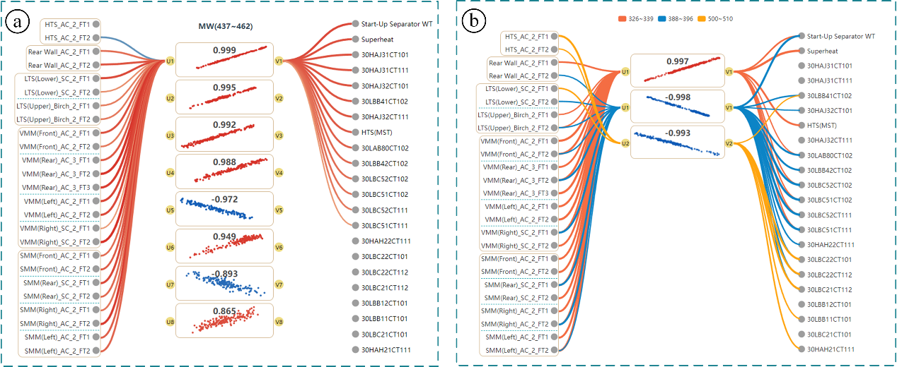 多工况下,专家更关注典型相关模式的差异。通过图7a中符号对比,发现高功率工况(569-645MW)下第一列符号高度相似,而低功率工况(339-409MW)下所有列均相似度较高。查看多符号散点图(图7b),专家发现第一个关系模式具有一般性,受功率影响小,第二和第三个关系则更独特。选择三个符号相似的工况(569-595MW、595-604MW和626-645MW)进行详细比较,发现原始参数对第一个典型模式的贡献值无显著差异(图7d)。此外,高功率和低功率工况下典型变量的值分布相反(图7c),专家猜测壁温在这两种工况下对后续控制参数(尤其是“过热度”)产生相反影响。