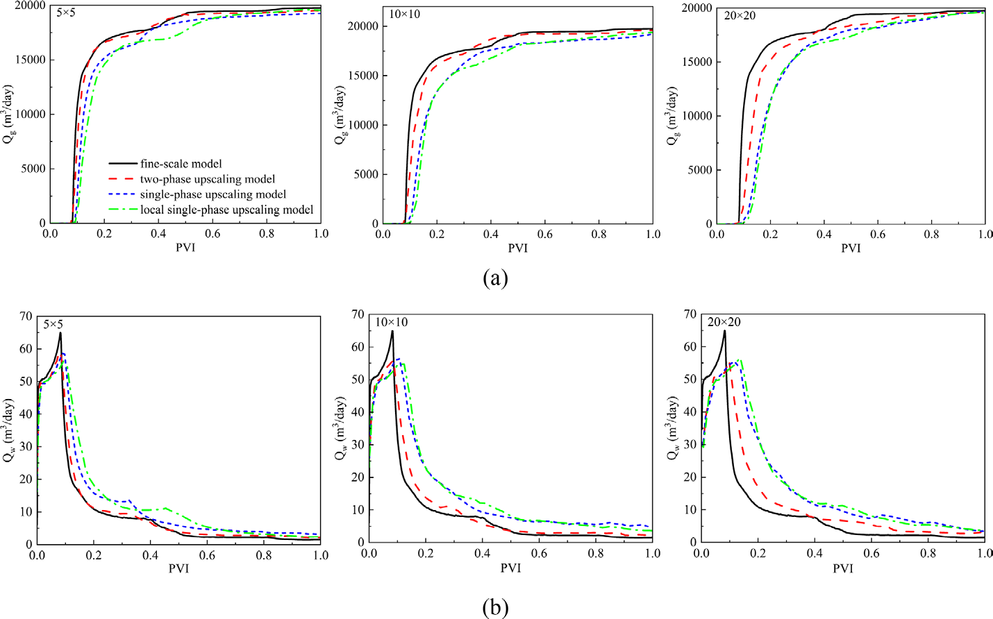 以图1所示的渗透率场及井眼轨迹模型为例,对该模型分别按升尺度倍数 5×5、10×10 和 20×20 进行尺度升级计算。图2展示了不同升尺度倍数下细尺度模型与粗尺度模型的结果对比。结果表明,本文提出的尺度升级算法(红色虚线)在各个尺度下均与细尺度模型结果(黑色实线)最为接近,展现出较高的准确性。其中,局部单相尺度升级模型(绿色点划线)为某商业软件采用的尺度升级算法,本文提出的算法明显比该商业软件方案更为准确。