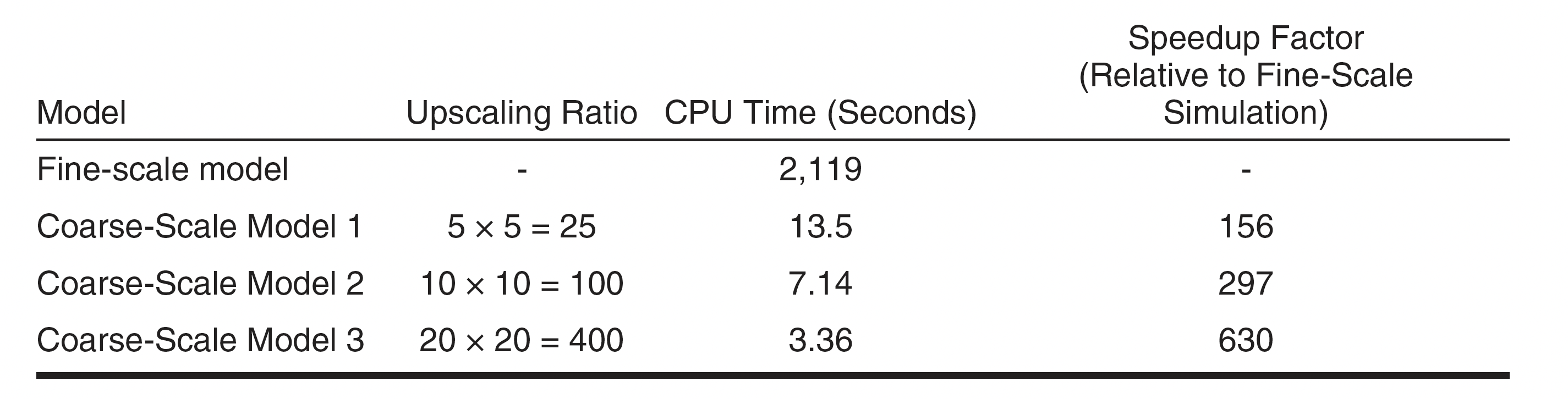 表1汇总了细尺度和粗尺度数值模拟的计算耗时。结果表明,当升尺度倍数为 25 时,计算速度提升 156 倍;升尺度倍数为 100 时,提升 297 倍;当升尺度倍数增至 400 时,加速比达到 630 倍。通过尺度升级,在确保较高计算准确度的前提下,实现了数百倍的计算加速。
