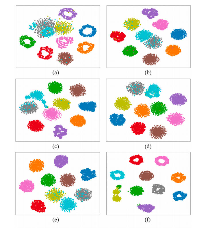 图2 不同方法所学特征的t-SNE可视化效果. (a) MAML. (b) RN. (c) PN. (d) CLPN. (e) MLCTL.(f) MLIIO.