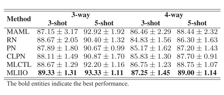为验证所提方法的有效性,在公开CWRU轴承数据集上对比了多种代表性方法(MAML、RN、PN、CLPN和MLCTL),结果表明所提出的元学习方法在小样本故障诊断的平均诊断精度方面更加出色。在3-way 5-shot设置下,所有方法的平均诊断准确率超过了90%,这表明即使在样本数量有限的情况下,MLIIO方法也能学习到有效的特征表示。在其他设置下,平均准确率也大多在80%到90%之间,显示了该方法在少样本学习问题上的鲁棒性。