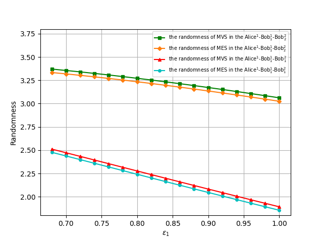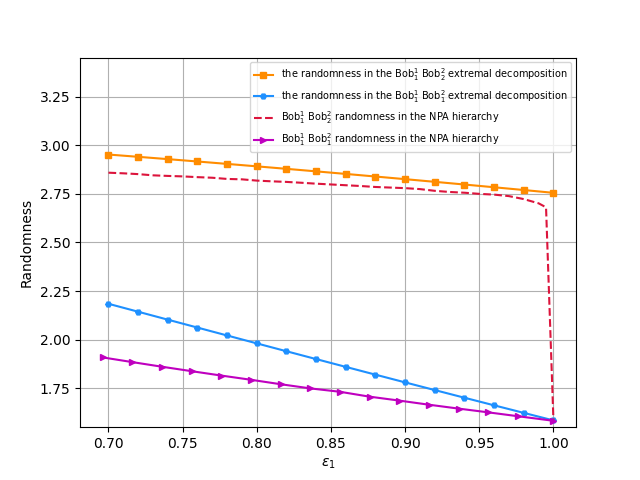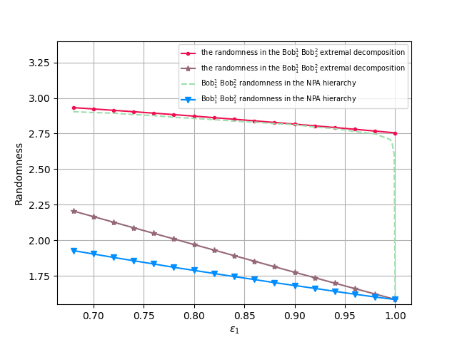 在设备可信方案中,我们利用上述随机性的定义以及给出的特殊POVM分解形式量化了最大纠缠态和最大违背态的随机性,在设备无关方案中,使用半正定规划方法序列NPA层级约束量化了其中的随机性。