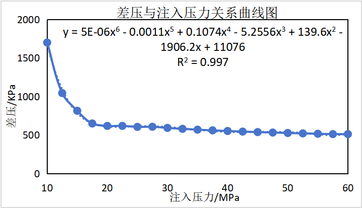 图4为喷嘴流量计差压与注入压力的关系曲线图,由图可知:差压与注入压力呈六次函数关系;随着注入压力的增加,差压逐渐减小;当注入压力小于17.5MPa时,随着注入压力的增加,差压减小速度较快;当注入压力大于17.5MPa时,随着CO2注入压力的增加,差压减小速度较慢几乎为水平线,分析原因为注入压力超过17.5MPa时,超临界CO2在井筒中的密度几乎不发生变化,因此对差压影响较小。