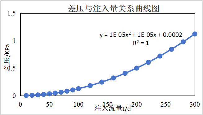 图6为喷嘴流量计差压与CO2注入量的关系曲线图,由图可知:差压与CO2注入量呈二次函数关系;随着CO2注入量的增加,差压逐渐增大;当CO2注入量小于100t/d时,随着CO2注入量的增加,差压增加速度较慢;当CO2注入量大于100t/d时,随着CO2注入量的增加,差压增加速度较快。由此可知,CO2流量注入较大时对喷嘴差压影响较大。