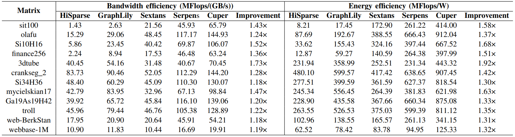 Cuper的几何平均吞吐量分别比最新的SpMV加速器HiSparse、GraphLily、Sextans和Serpens高出3.28倍、1.99倍、1.75倍和1.44倍。此外,几何平均带宽效率分别提高了3.28倍、2.20倍、2.82倍和1.31倍,而几何平均能效则分别优化了3.59倍、2.08倍、2.21倍和1.44倍。