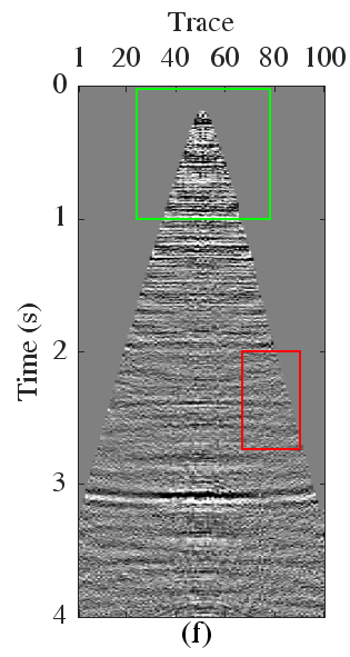 图4 (a)-(c)分别是常规PRT、高阶PRT和提出方法估计的多次波;(d)-(f)为三种方法的多次波压制结果。