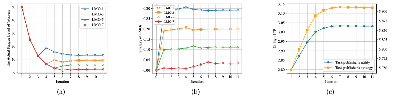 图4 三层博弈框架中迭代次数变化对性能的影响。(a) 工人的实际疲劳水平。(b) 本地模型拥有者的策略。(c) 任务发布者的效用和策略。