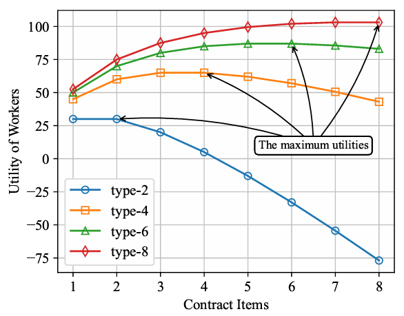 我们设计了大量模拟实验,以评估分层激励机制框架的有效性和算法的最优性。图2显示了本地模型拥有者在选择任务发布者设计的不同契约条目时的效用。