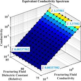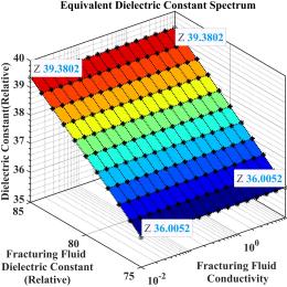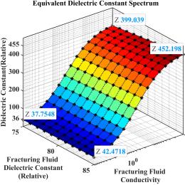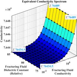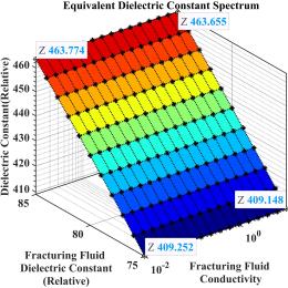 在实验部分,我们基于FEM对支撑裂缝内容物进行等效结构建模。将讨论基于数值模拟的裂缝填料的等效电导率和等效介电常数的特征。通过计算发现,在使用低电导支撑剂情况下,裂缝内容物的介电常数与压裂液的电导率呈正相关。在使用高导支撑剂条件下,可以观察到内容物等效相对介电常数不再与压裂液的电导率密切相关,它只与内容物组分的介电常数有关。内容物等效电导率与组分电导率有很强的相关性,并且随着内容物组分电导率的增加而增加。