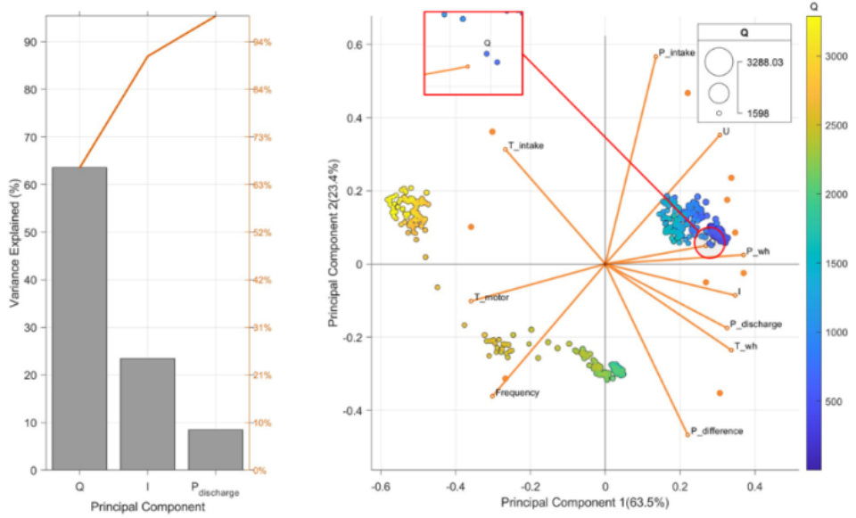 应用主成分分析方法,分析了该井发生故障前后数据之间的关联性。在图3中,第一主成分井口的产液量,贡献率为63.5%,分析结果与物理认识相符,电潜泵井在运行过程中,井口产液量最能反应泵的健康状态,电泵在亚健康状态和故障状态下,产液量根据不同的故障类型会随之下降;第二主成分为电流,通过监测电潜泵的电流信号,从而判断是否存在故障,例如,如果电流出现明显的畸变或电流峰值异常高或低,可能表示电潜泵存在故障,如电机绕组短路、轴承损坏等;第三主成分为出入口压差,出入口压差是直观反应电潜泵运行状态和性能的重要指标。