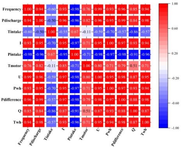 利用皮尔逊相关性分析分析 A01井电泵监测系统可监测参数两两之间的关联程度,在图2中,参数两两之间都有很强的相关性。