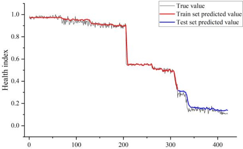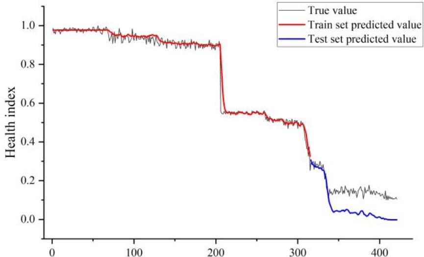 模型表现结果如图8和图9所示,图中黑线为真实值,红线为训练集预测值,蓝线为测试集预测值。图8中,尽管LSTM在训练集上表现出较好的拟合效果,但是在其测试集中,模型预测出了健康指数变化趋势,但是由于在训练集中缺少故障样本,因此模型预测的健康指数偏低,与真实值不符。从图9可以看出,在PC-LSTM的训练集中,无论实在测试集还是验证集中,模型都准确的预测了健康指数的变化趋势,相较与LSTM模型,PC-LSTM在测试集中,健康指数预测结果更接近真实值。