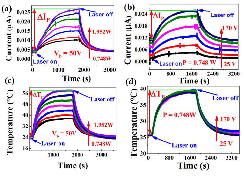 图2(a)在不同激光功率下,原油样品的电流随时间的变化;(b)不同偏置电压下,原油样品的电流随时间的变化;(c)在不同激光功率下测量电流时,原油温度随时间的变化;(d)在不同的偏置电压下测量电流时,原油温度随时间的变化。