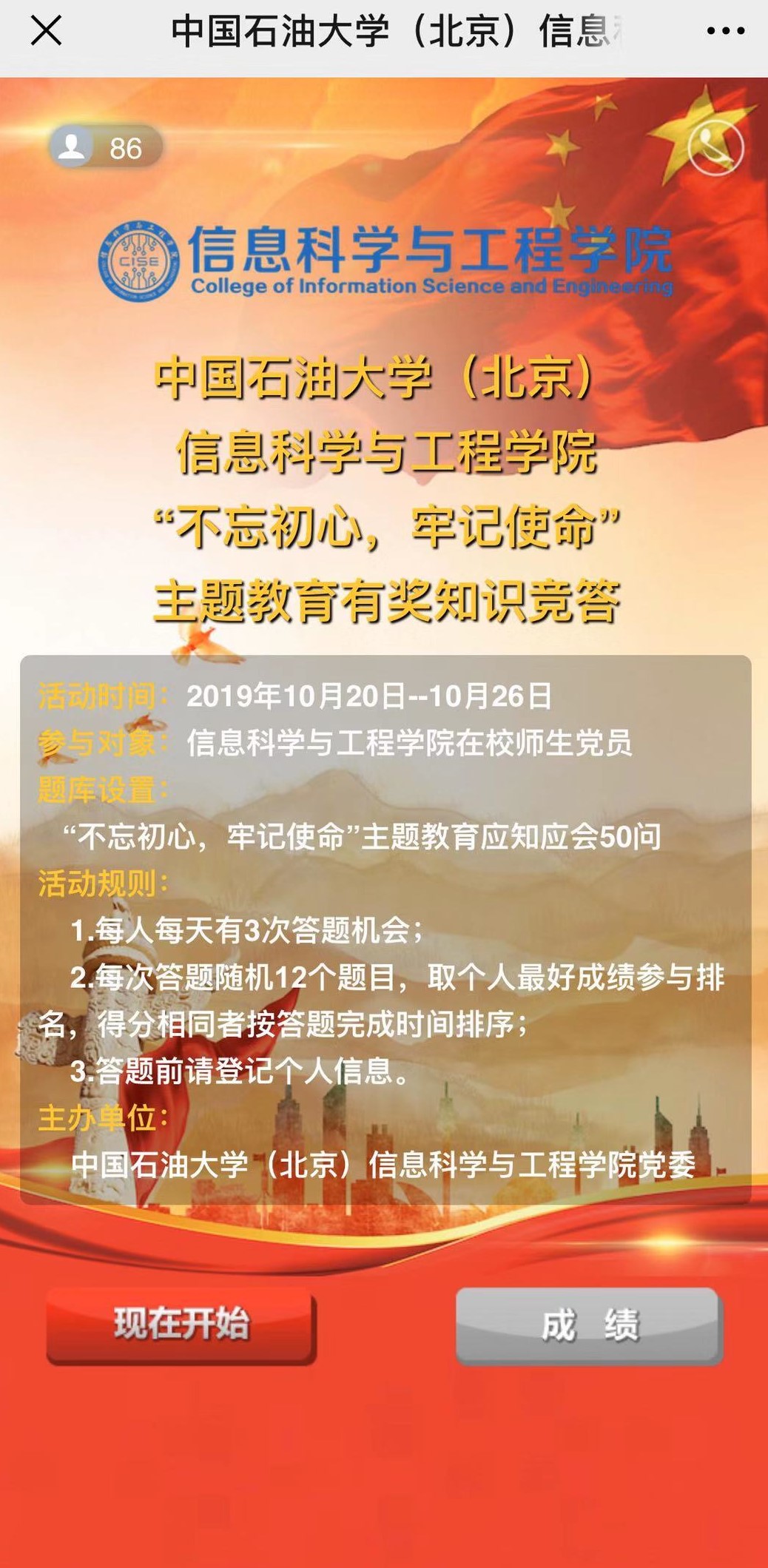 此次网络知识竞赛仿照“学习强国”学习平台中“每日答题”的形式,采取微信答题的方式,题型分为选择题、填空题和判断题的形式,以学校组织部印发的《“不忘初心、牢记使命”应知应会50问》为题库,每人每天三次答题机会,最后以答题分数和答题时间进行排名。活动期间,参与答题人数达400余人次。