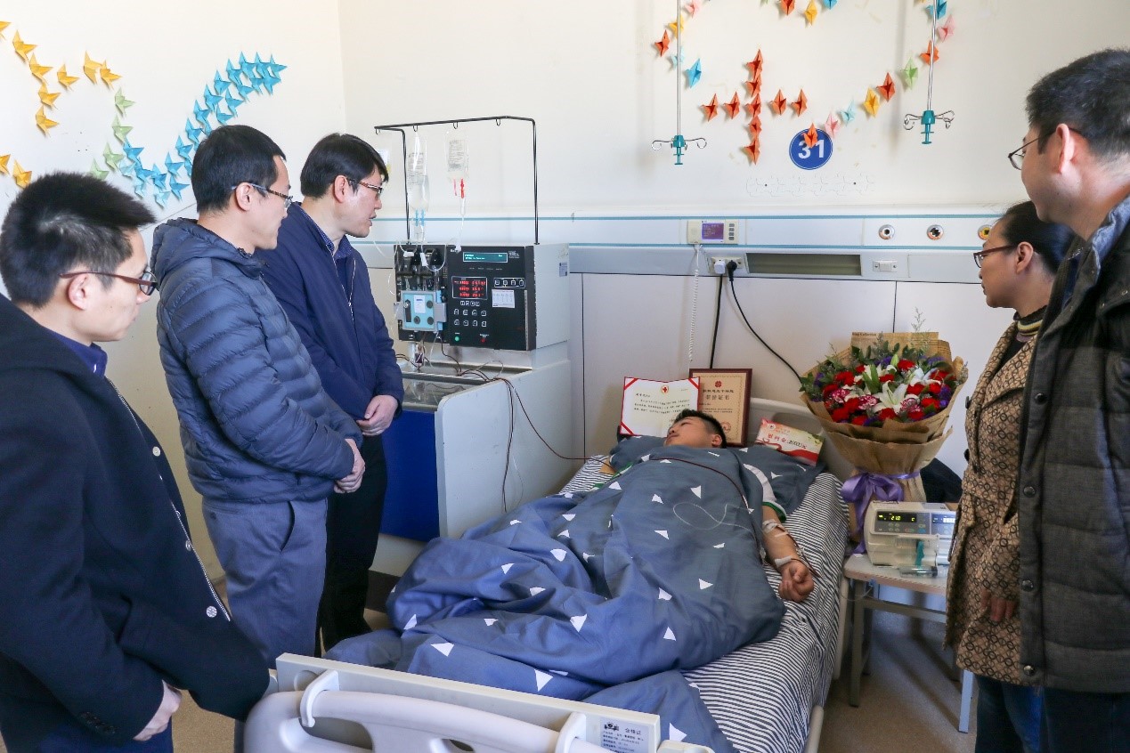 3月7日上午,石大党委副书记、副校长韩尚峰,学生工作部(处)、信息科学与工程学院、校医院等相关单位负责人前往解放军总医院第六医学中心看望慰问倪梦凡。中国造血干细胞捐献者资料库北京管理中心、昌平区红十字会等单位相关领导也来到医院对倪梦凡表示关心和感谢,并为他颁发了荣誉证书和纪念铭牌。