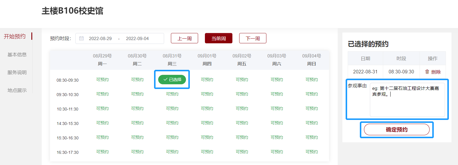 2.选择参观时段,填写参观事由,点击“确定预约”。