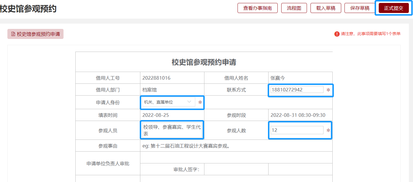 3.填写校史馆参观预约申请表单中的申请人身份、联系方式、参观人员和参观人数,点击“正式提交”,流程转至申请单位负责人审批。