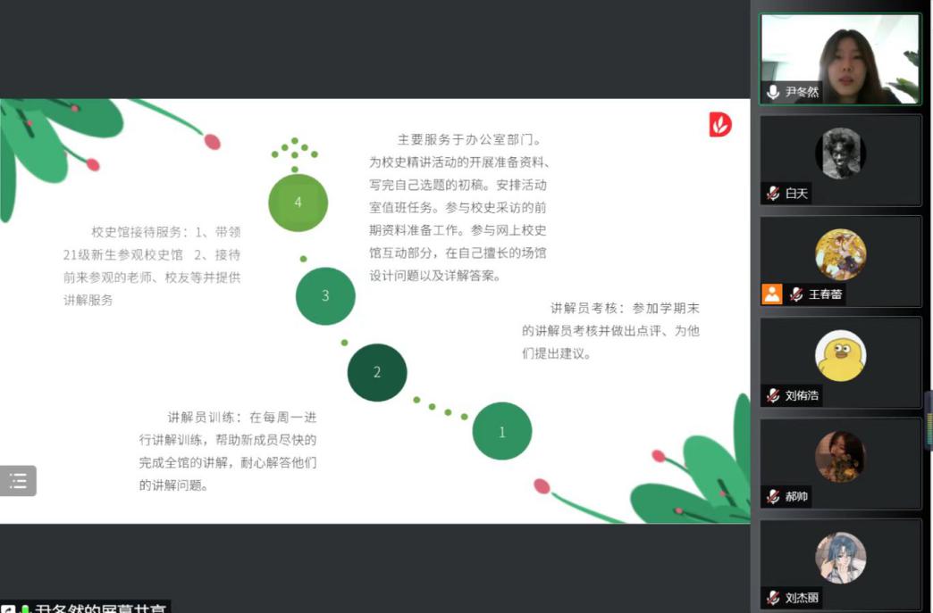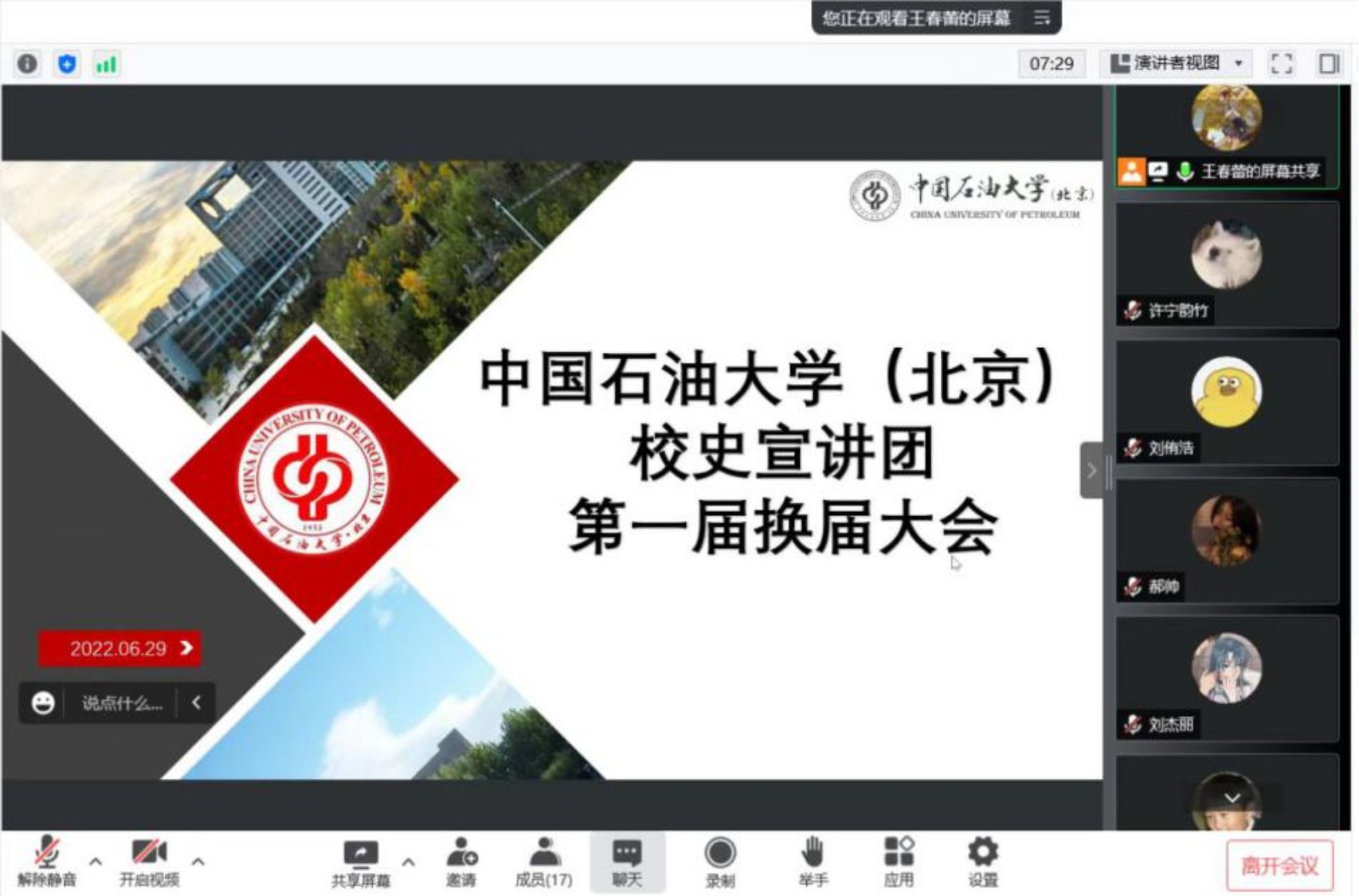 为进一步做好校园文化宣传工作,增强学生社团的凝聚力和向心力,6月29日下午,中国免费一级毛片(北京)校史宣讲团通过腾讯会议线上举行第一届换届大会。图书馆直属党支部书记兼副馆长、档案馆馆长海凤,社团指导教师毕然、张赢今,社团第一届主席团成员、第二届各部门部长候选学生参加了会议。